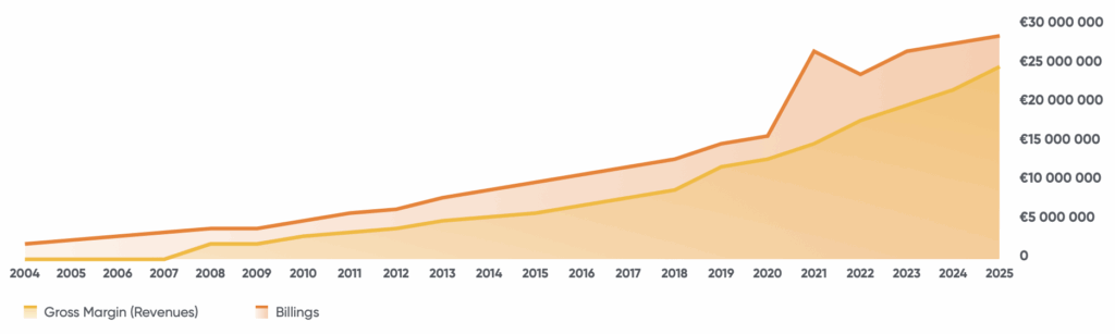 Prevemos que, até ao final de 2025, iremos alcançar um volume de negócios de 27 milhões de euros, com um crescimento de 3,8% YoY face a 2024, e uma margem de 19 milhões, o que confirma a consistência da nossa trajetória. Estes resultados refletem ainda a robustez da nossa estratégia e a nossa vontade de crescer de forma constante e sustentada em todos os segmentos em que operamos.